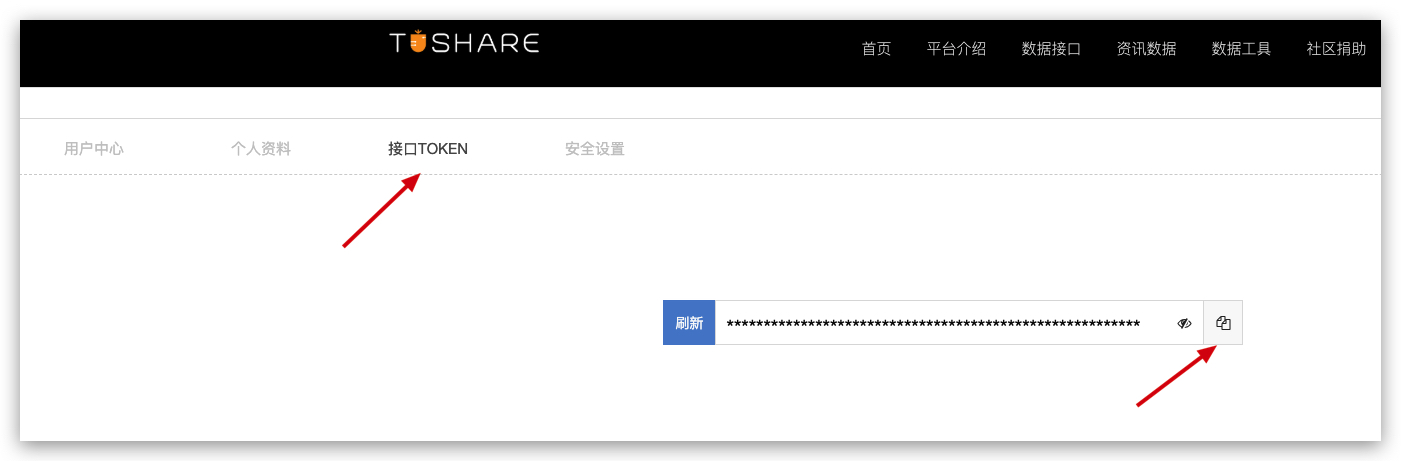 第三步:如果没有可以到官方地址注册:https://tushare.pro/weborder/#/login?reg=916075 ,从我的地址进入注册会赠送50积分。登录官方进入个人中心选择接口token选项卡,点击箭头位置复制token。