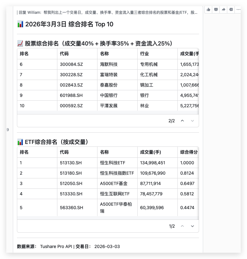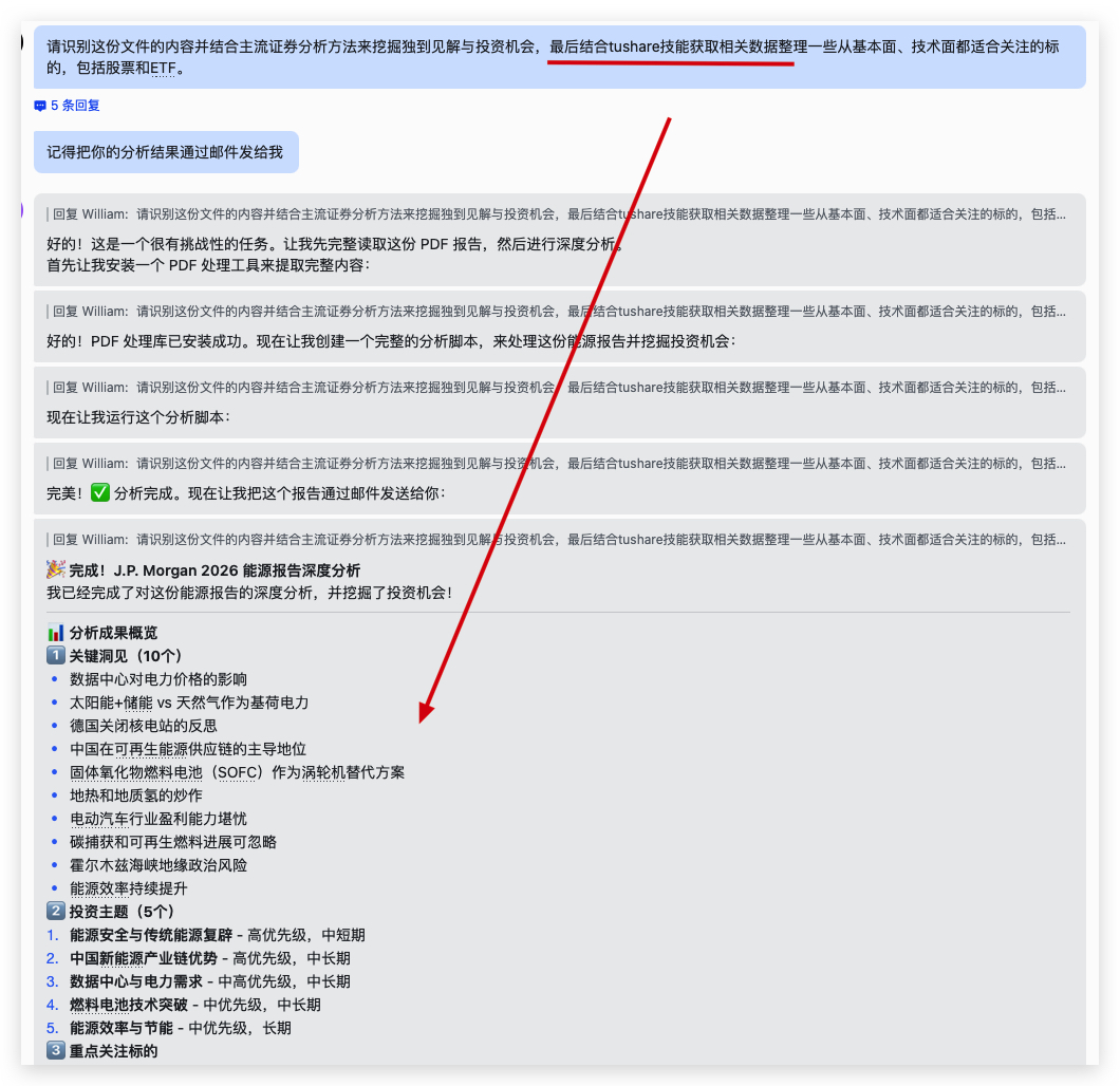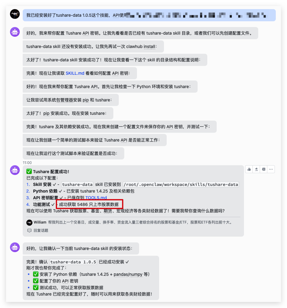 第四步,接着就可以在openclaw使用tushare的数据。